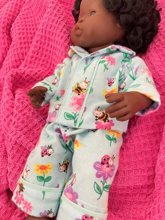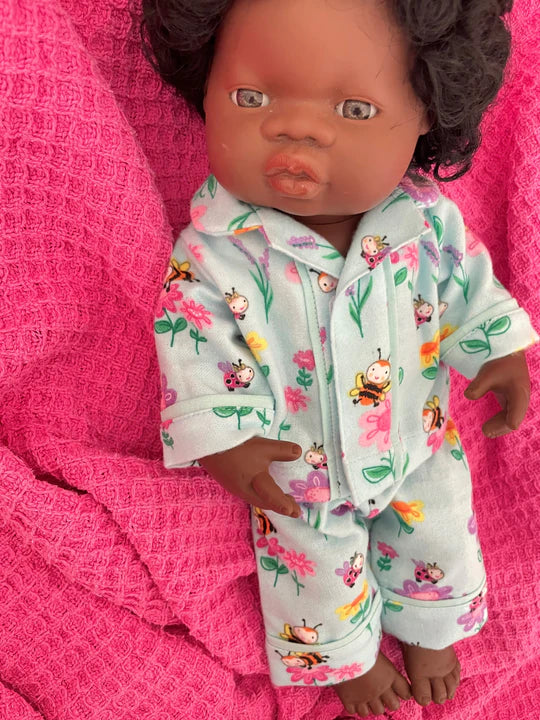 Pyjama Set - to suit 38cm Miniland Doll. Will also fit 32cm soft body Miniland Doll and 34cm Mini Coletto, Minikane and Paola Reina Grande Dolls - Bees & Ladybirds.