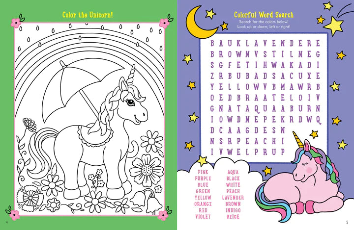 - Colourful activity book is filled with unicorn-themed mazes, word searches, colouring, and more!