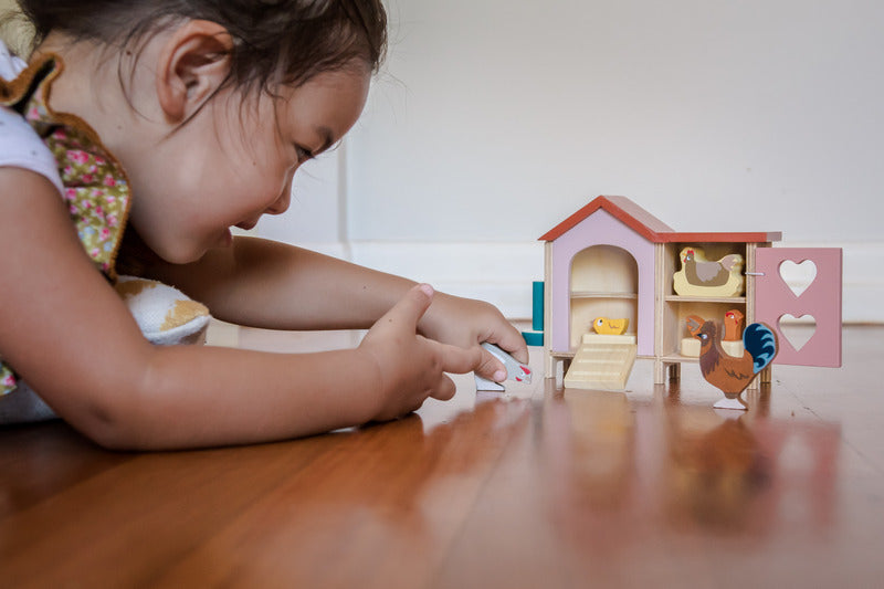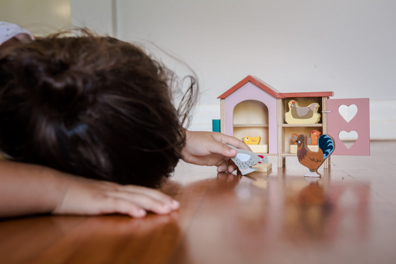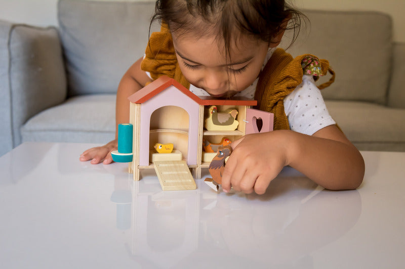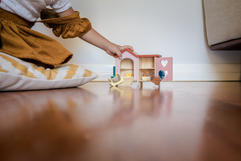 An adorable wooden doll's chicken coop with chickens.