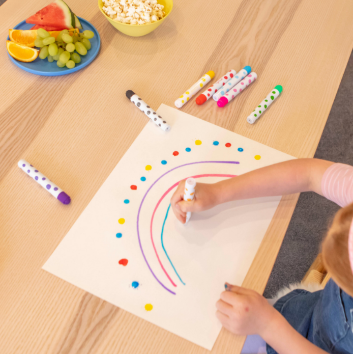 A super fun set of eight high quality, marker-style dot paints. Designed to make painting clean and easy, simply twist off the caps and let the fun begin. No cups or brushes to set up or wash and no drips or spills. Kids will love experimenting with the different effects that can be achieved with the round sponge tip applicator — from fun dotty spots to blending and layering and broad colour sweeps too. The perfect tool for creative art sessions.