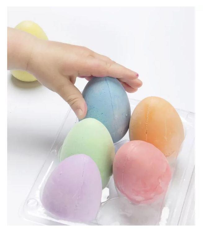 First Creations Easi-Grip egg chalk was designed specially to fit in the palm of a child’s hand. This non-toxic washable chalk allows young children to have more control over their drawing. Use on a variety of surfaces such as blackboards, pavement and concrete surfaces. Chalk is easily removed by washing down with water. This set includes half a dozen eggs in pink, green, orange, blue, purple and yellow in a sturdy container for easy storage.
