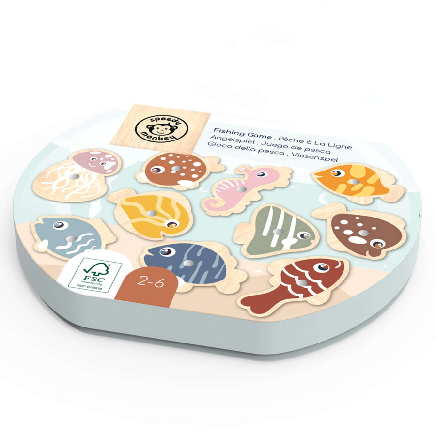 Time to go fishing? Grab your fishing rod for a fun time! These colourful wooden fish can be hooked up by the magnetic wooden rod and once safely attached, lowered back onto the board. Requiring skill and concentration to catch each fish. This Helps to develop dexterity and co-ordination. This toy is crafted from sustainably sourced wood from FSC® certified forests and coated with non toxic paint.