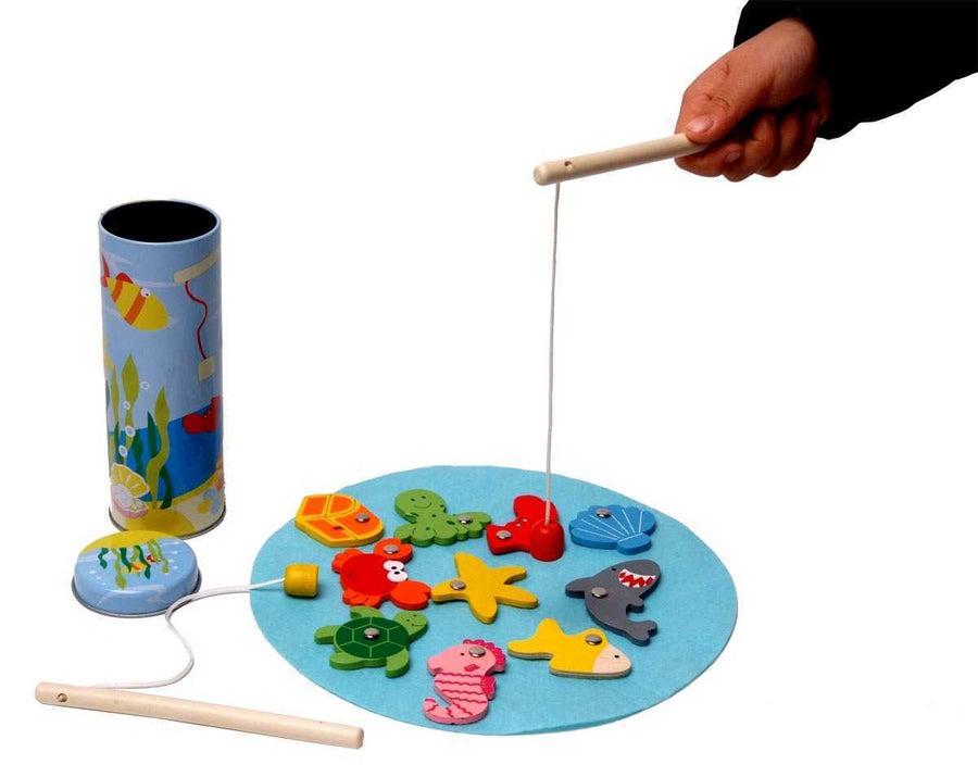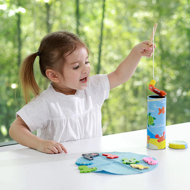 Fishing games in a tin tube for retail. It will keep the kids entertain for hours, fishing the fishes out of the pond. Helps with fine motor skills.Each tin box consists of 2 magnetic fishing rods, 1 felt fishing pond and 8 sea creatures, a boot and a wooden chest.