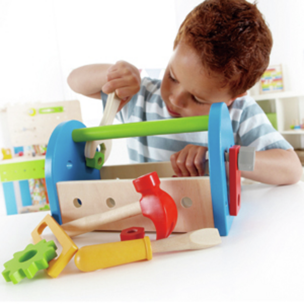 Nuts, bolts, and all the tools little builders need to tinker, are conveniently packed in this ready-for-action case. Name the tools that your child uses. Describe what each does. The tool box was created so that pieces could be attached right on it. Structures can also be made separately.