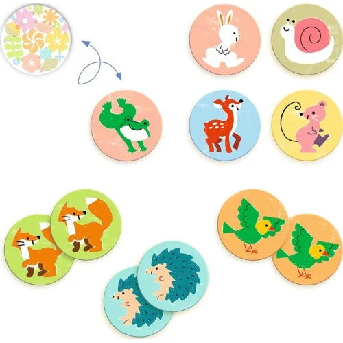 Children will love this fun and colourful matching game. This game develops memory and hand-eye co-ordination as the child plays their way though finding pairs of animals with the bright disks. An FSC® certified paper and cardboard product.