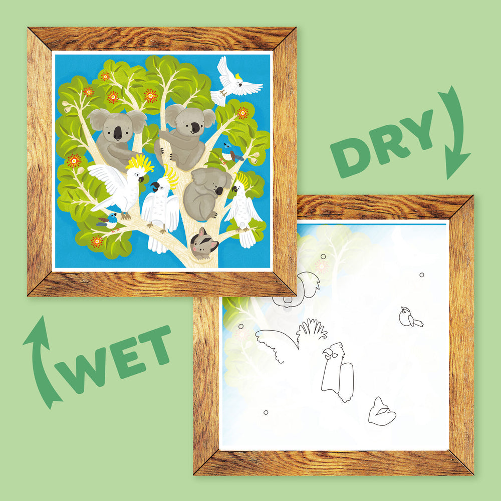 Ideal for portable play (no messy paintbrushes, no water glasses to knock over) this set contains four illustrations of typical Aussie bush scenes for kids to discover. The reverse side of each illustration board includes a list of fun things to find and count as you paint, providing hours of fun!