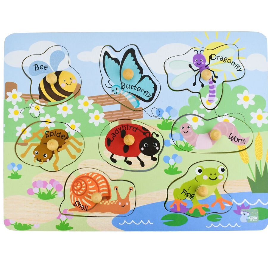 The 2 in 1 Insect and Their Homes Peg Puzzle by Koala Dream is a captivating educational toy that invites children to explore the fascinating world of insects. This peg puzzle features eight amazing minibeasts, including a bee, butterfly, dragonfly, spider, worm, ladybird, frog, and snail.