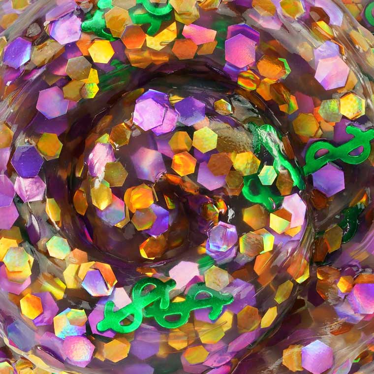 - Colour: Gold and purple sparkle with green dollar signs