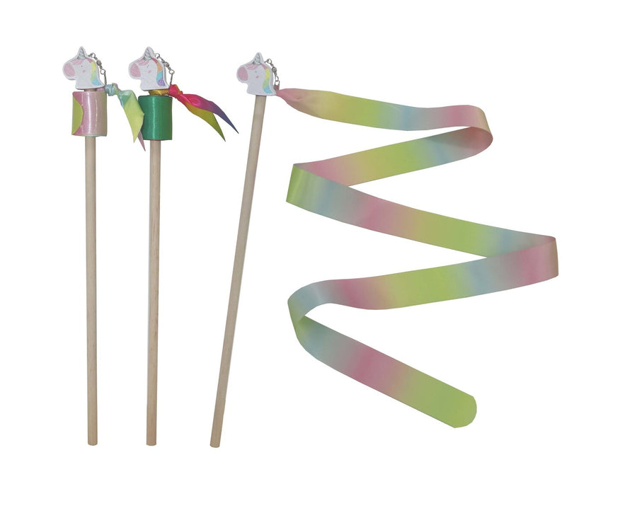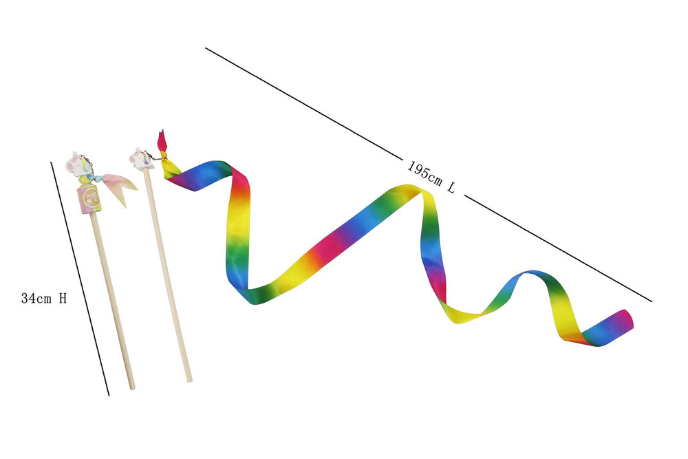 This beautiful ribbon comes in two assorted rainbow colours and features a cute unicorn head. Hold the wooden handle as you swirl, shake, or wave the ribbon around creating figures in the air.