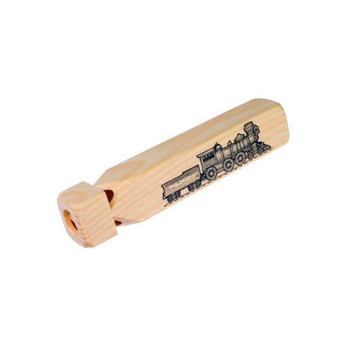 Blow gently on this wooden whistle and hear the soothing sounds of a train station whistle in your ears. You'll create a gentle, clear whistling sound through this whistle, making it a joy to blow over and over again. Create a tune or just enjoy the noise, this whistle is fun for everyone. This train whistle is perfect for any train enthusiast, musical group or someone just wanting to make some noise! Each whistles is made from pine wood printed with a train image on it. Finished to a smooth, high quality finish, these whistles are also individually wrapped for hygiene.