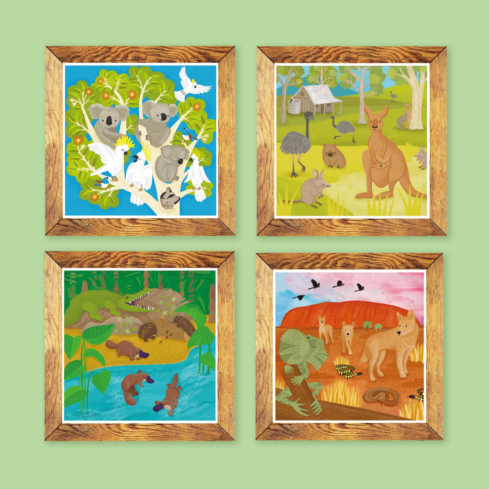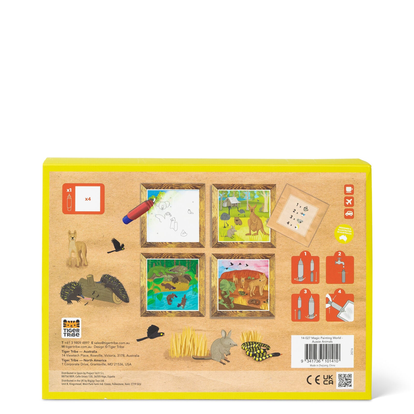 Ideal for portable play (no messy paintbrushes, no water glasses to knock over) this set contains four illustrations of typical Aussie bush scenes for kids to discover. The reverse side of each illustration board includes a list of fun things to find and count as you paint, providing hours of fun!