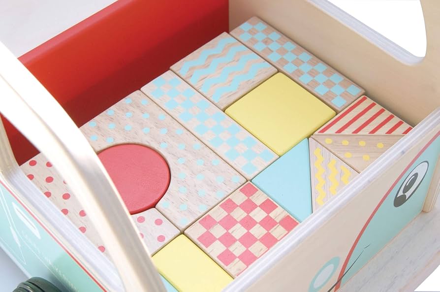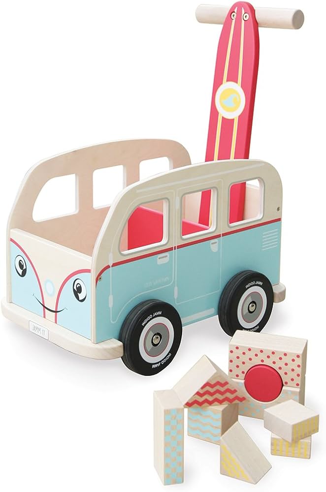 This retro Camper Van walker is designed with chunky wheels and a surfboard handle for easy manoeuvrability. Includes 14 shaped, solid rubberwood blocks and a shape-sorter, helping to develop cognitive skills. Comes with EVA trimmed wooden wheels that protect surfaces for indoor riding. Made with eco-friendly sustainable materials.
