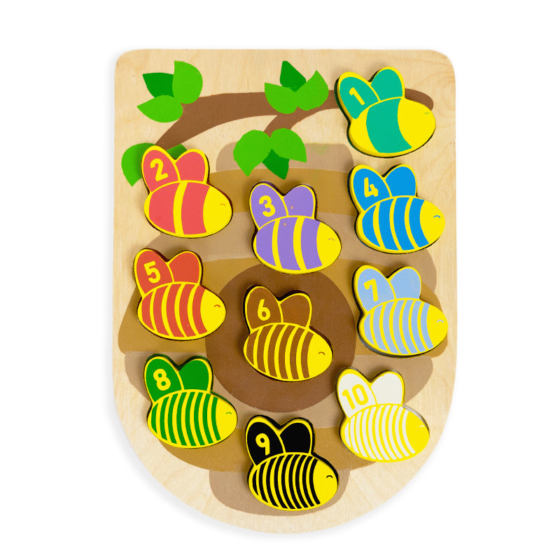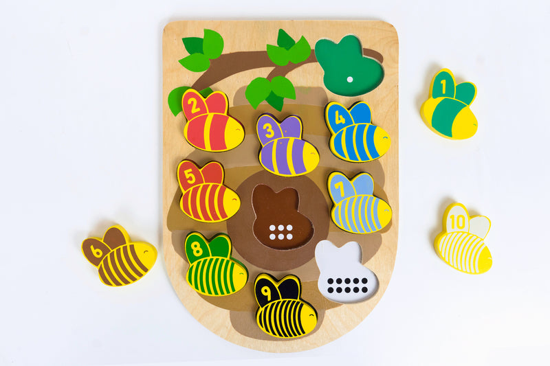 Get your little ones buzzing with excitement with this adorable wooden puzzle featuring cute little bees with numbers 1-10 on each one. Match the numbered bee with the dotted form of the number.