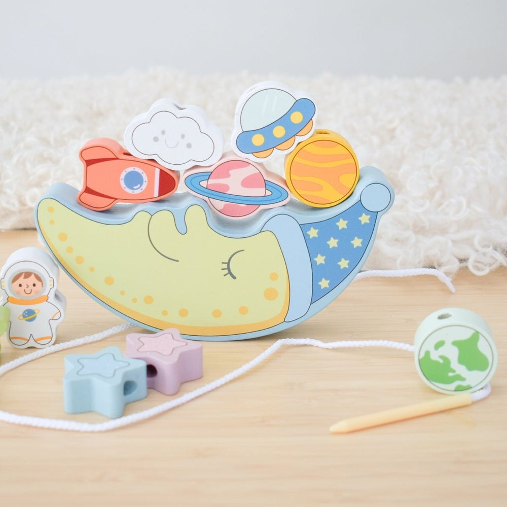 Kids will delight in the Tooky Toy 2 in 1 Space Balance and Lacing Set, a versatile toy that combines balance and lacing activities for endless fun. Challenge young minds to balance 10 colourful blocks on the sleepy moon’s face, placing rockets, astronauts, stars, UFOs, and planets without tipping them over. This engaging game helps develop fine motor skills and problem solving abilities as children carefully stack and balance the blocks.