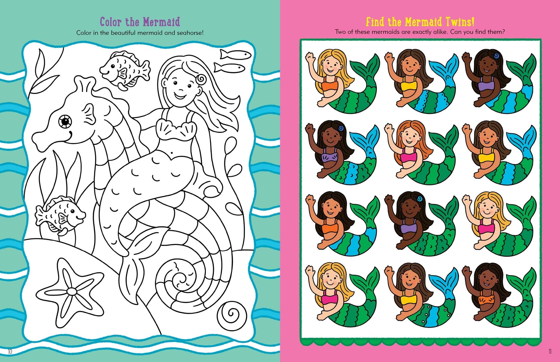 - Vibrant activity book is filled with mermaid-themed mazes, word searches, coloring, and more!
