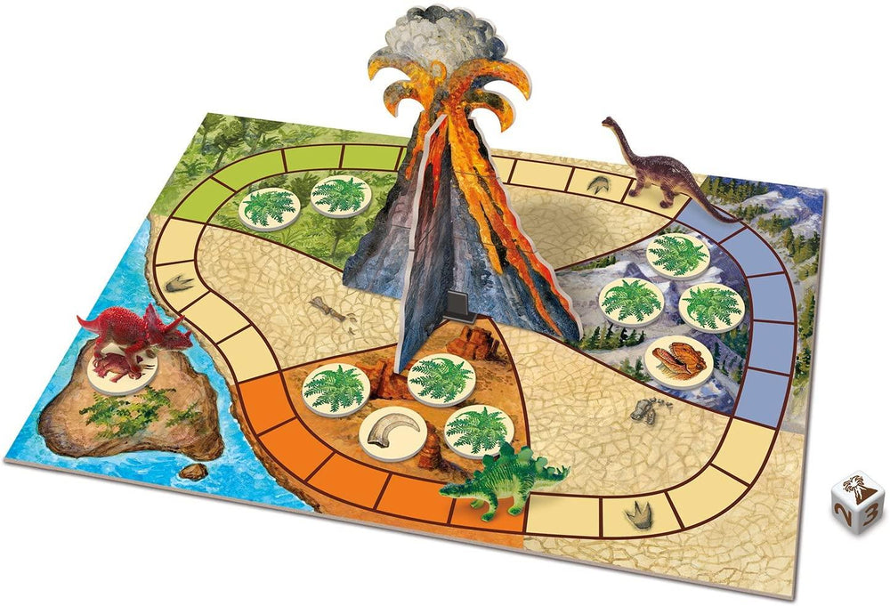 Three dinosaurs are lost in the ferns and a volcano is threatening to blow! Work together to move the dinosaurs around the board. Uncover the matching dinosaurs under the fern tokens to rescue all three dinosaurs. Get the dinosaurs safely to the island before the volcano erupts and everyone wins!