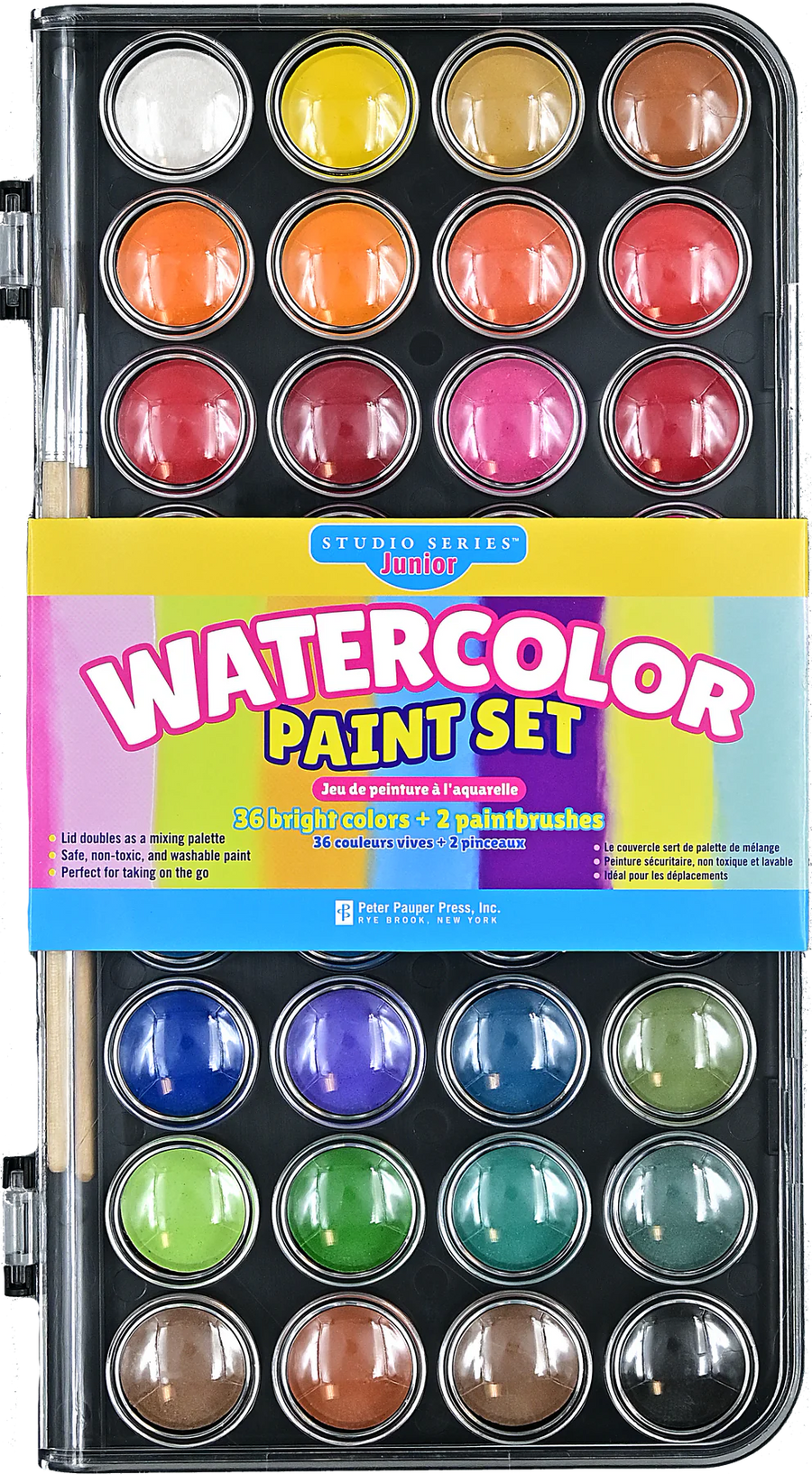 • Studio Series Junior Watercolor Paint Set set comes with 36 bright colors, 2 paintbrushes, and a handy plastic storage case.